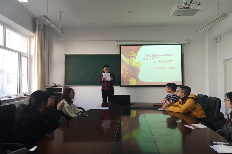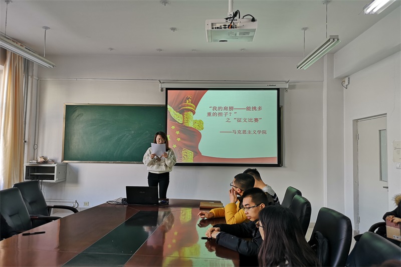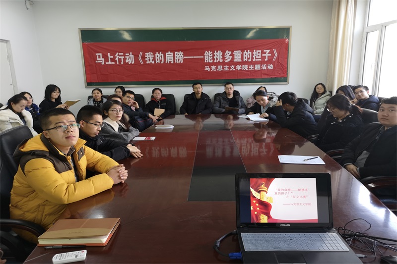 2018年12月25日中午浦京集团官网在盛乐校区学院楼举办“马上行动--我的肩膀能挑多重的担子”之征文比赛活动。团总支书记范晓刚老师及全体研究生参加了本次活动。