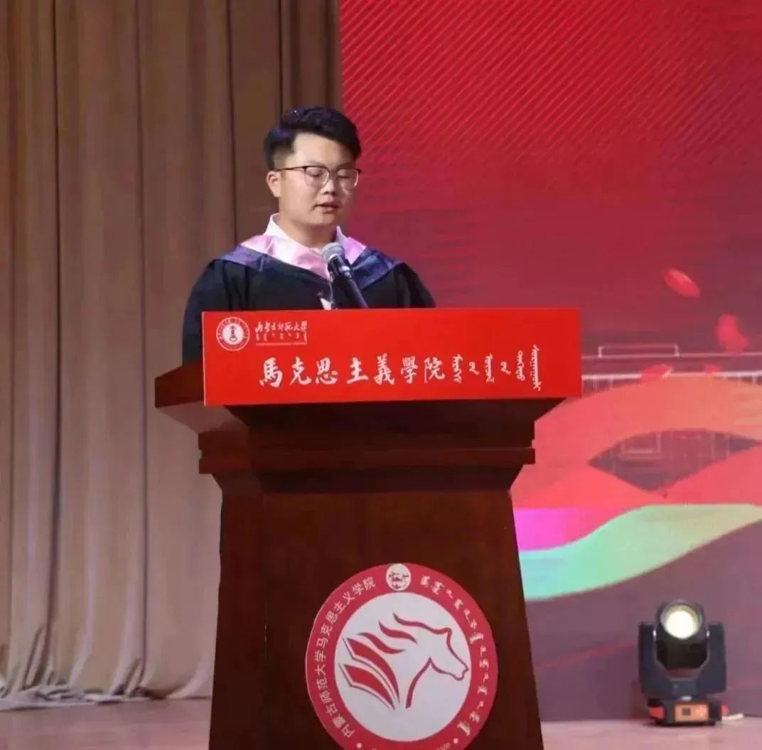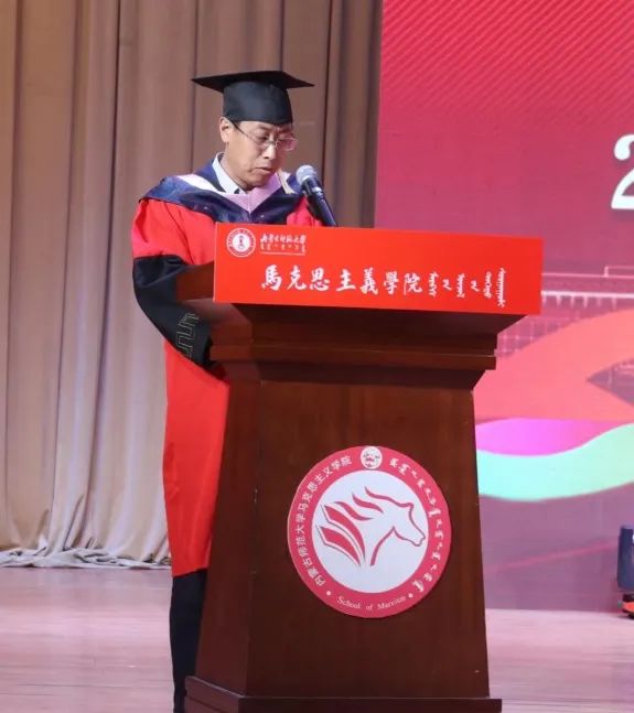 本科生代表王思儒同学对各位老师表达了衷心的感谢,一朝沐杏雨,一生念师恩。他表示,青年们要励志坚定有所为,坚定理想信念有所闯,放眼于更宽广的天地和更长远的未来,身为一名马院学子,无论身处什么岗位,应牢铸深厚的家国情怀,为国家贡献力量,为时代注入能量。