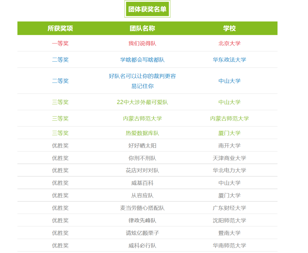 经过激烈比拼,在核算四轮综合得分后,大赛桂冠花落北京大学“我们说得队”。亚军被来自华东政法大学的“学啥都会写啥都队”和来自中山大学的“好队名可以让你的裁判更容易记住你”队揽获。来自中山大学的“22中大涉外最可爱队”、350vip浦京集团官网的“350vip浦京集团官网队”及来自厦门大学的“热爱数据库队”则获得季军殊荣。