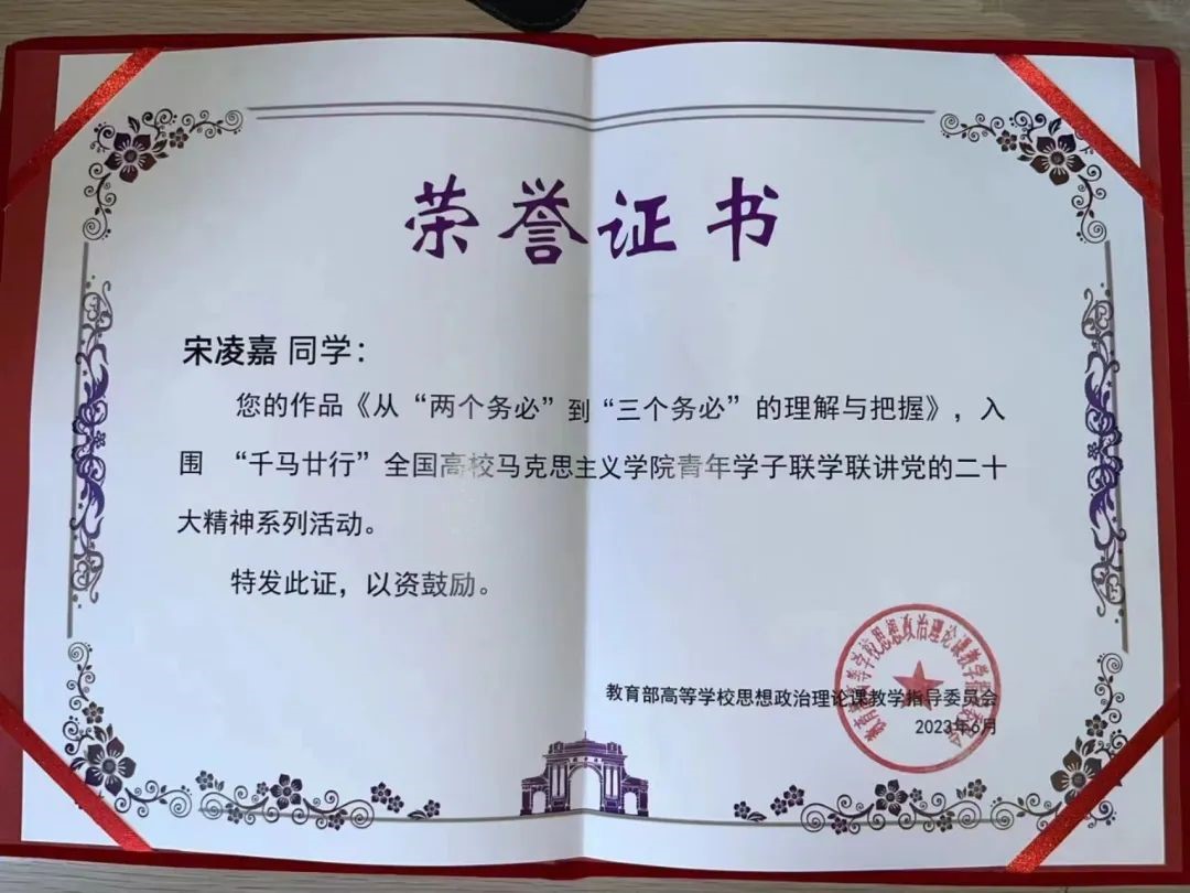 2022级硕士研究生宋凌嘉同学的作品《从“两个务必”到“三个务必”的理解与把握》,入围“千马廿行”全国高校350vip浦京集团官网青年学子联学联讲党的二十大精神系列活动。