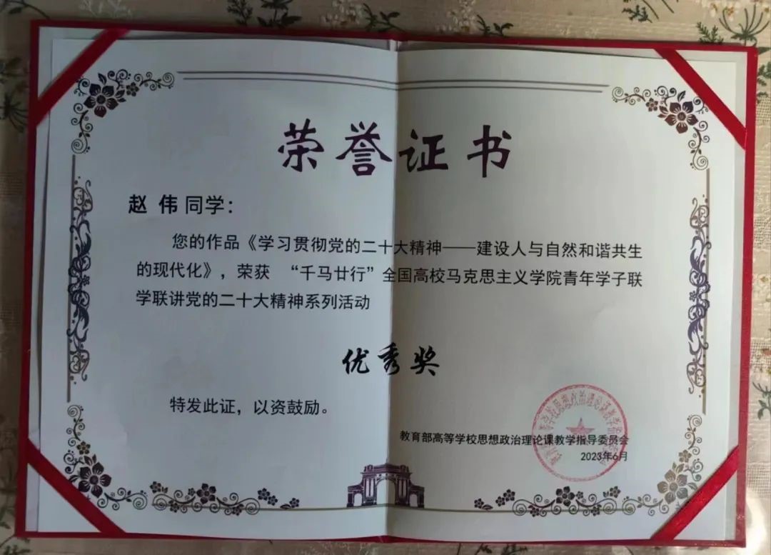 浦京集团官网2021级硕士研究生赵伟同学的作品《学习贯彻党的二十大精神——建设人与自然和谐共生的现代化》荣获“千马廿行”全国高校350vip浦京集团官网青年学子联学联讲党的二十大精神系列活动优秀奖。