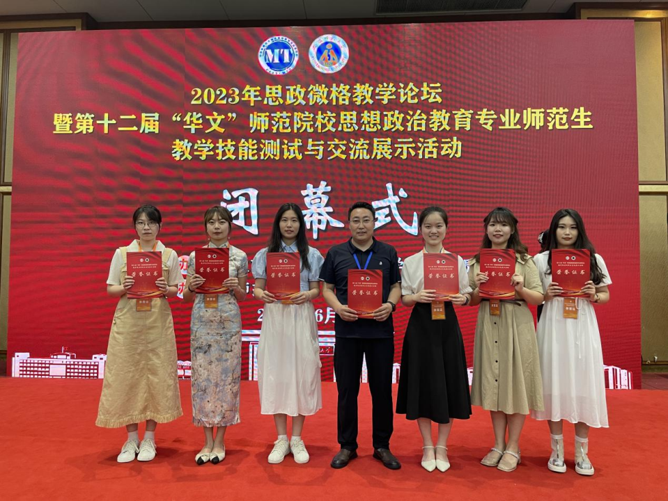 为加强高校思想政治教育师范生教学能力,培养学生的创新意识,促进学科发展,打造“高素质、专业化、创新型”的教师队伍,6月2日至5日,由中国教育技术协会微格教学专业委员会主办、安徽师范大学承办,2023年思政微格教学论坛暨第十二届“华文”师范院校思想政治教育专业师范生教学能力测试与交流展示活动在美丽的江城安徽芜湖举行,来自全国80余所高校450余名学生参加了比赛。经过激烈的角逐,浦京集团官网参赛的6名同学凭借扎实的教学技能功底,在教学设计测试和教学技能竞赛中全部获奖。在教学技能测试比赛中,刘子潇、全馨获得一等奖,徐春宇、侯佳琪、童微获得二等奖,乌苏嘎拉同学获得三等奖。在教学设计测试比赛中,童微、乌苏嘎拉、刘子潇、全馨获得二等奖,侯佳琪获得三等奖,徐春宇获得优秀奖。“华文”全国师范生教学技能大赛是我国师范院校思想政治教育专业领域规模最大、规格最高、参与高校最多、影响最广的赛事之一。比赛启动以来,学院高度重视,组织专业技能突出,在省级以上教学大赛中具有丰富指导经验的钢特木尔、顾媛媛两位老师进行精心辅导,参赛学生积极备课,在教学设计、课件制作、说课技巧等方面反复训练,为比赛做了充分的准备。赛场上浦京集团官网参赛学生以知识为云梯,彰显个性,发挥特长,在三尺讲台上满怀赤诚育人心,尽显350vip浦京集团官网马院学子风采。