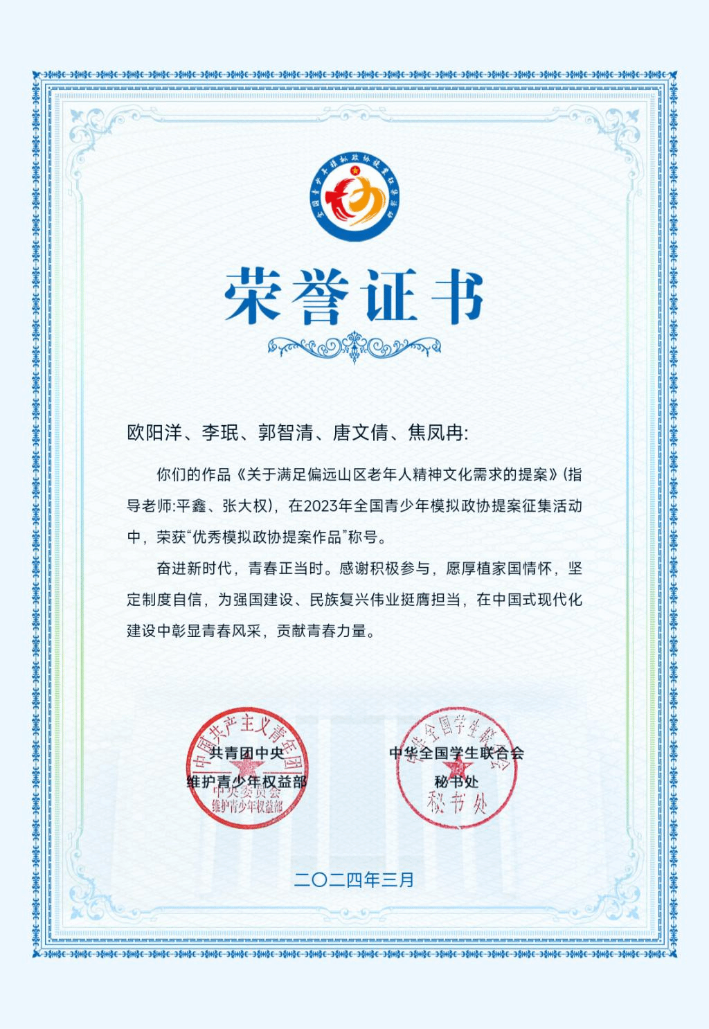 全国青少年模拟政协提案征集活动是一项旨在提高学生参政议政意识、培养其独立思考能力和团队协作精神的社会实践活动。青年团中央维护青少年权益部开展了2023年度全国青少年模拟政协提案征集活动,浦京集团官网报送的《关于满足偏远山区老年人精神文化需求的提案》是由浦京集团官网学子欧阳洋、李珉、郭智清,唐文倩和焦凤冉同学在平鑫老师的指导下策划而成。从全国57.8万篇作品中脱颖而出,获得荣誉证书。